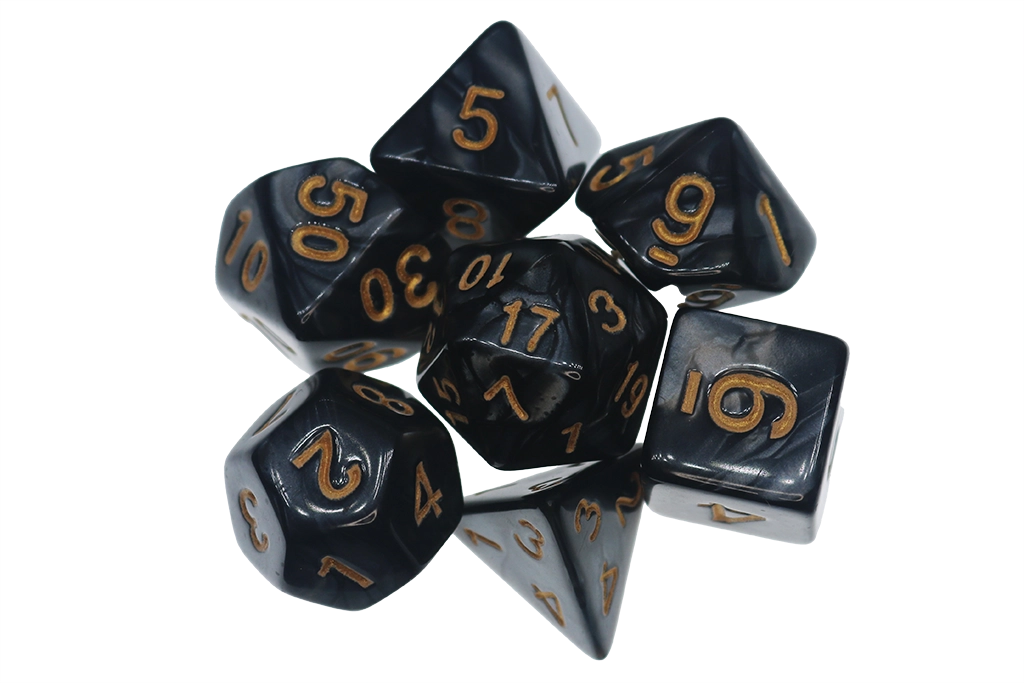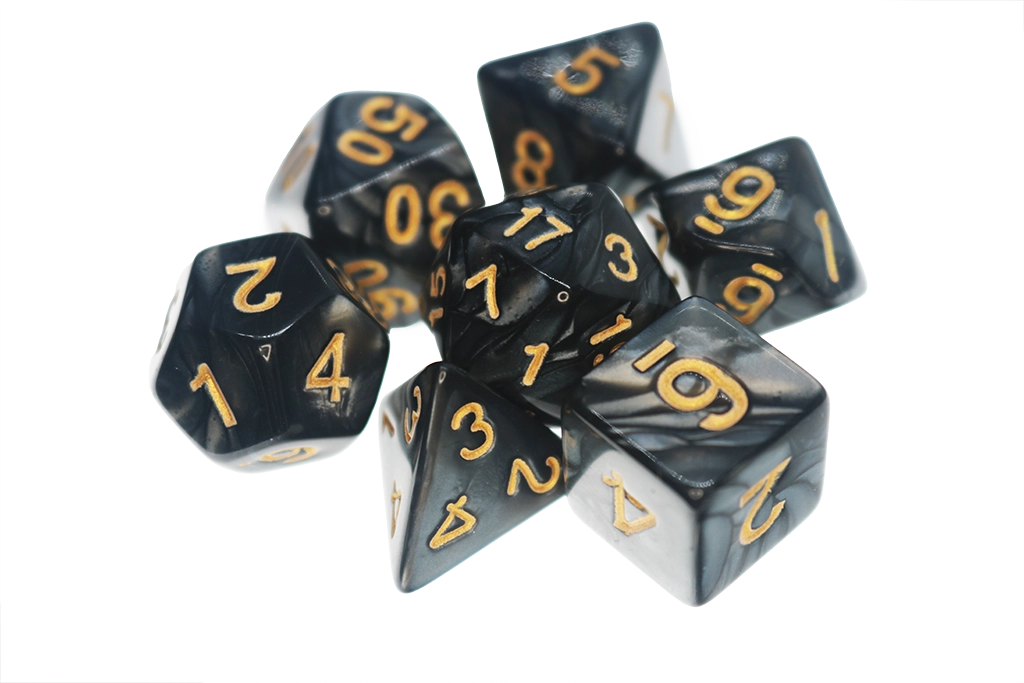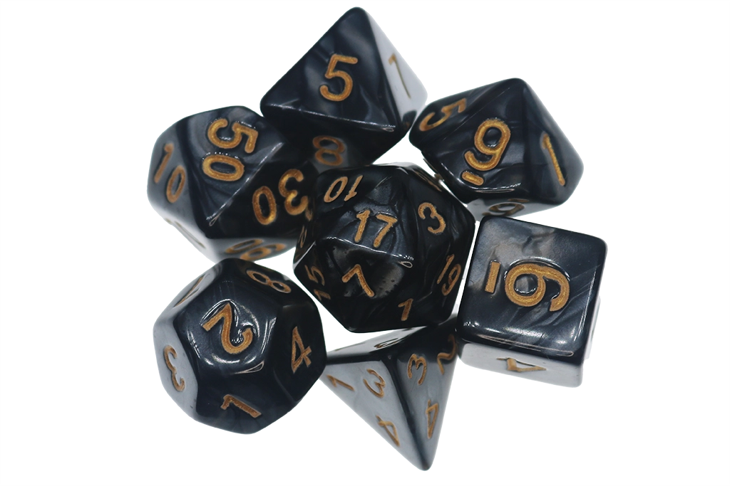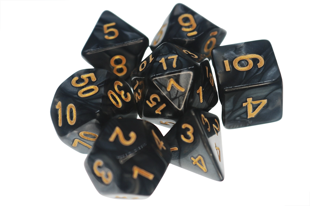 Experience the sleek sophistication of our Black Marble Dice set, featuring a captivating blend of black and grey hues. Elevate your gaming sessions with a touch of timeless elegance.