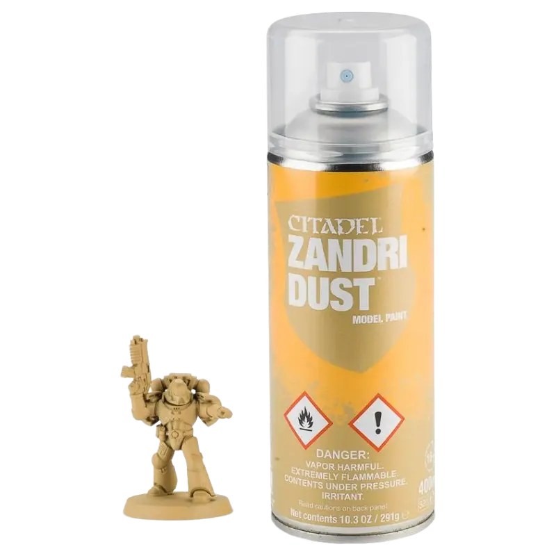 Zandri Dust Spray Paint is a versatile tan basecoat designed for Warhammer miniatures and scenery. Matching the Citadel Zandri Dust paint pot, this spray gives even coverage and smooth colour consistency, making it ideal for desert armies, bone details, or weathered armour. Great for Astra Militarum, skeletons, and terrain pieces, this primer speeds up your painting process while keeping a high-quality finish.