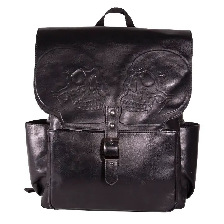 Crafted in a sleek black finish, this backpack features an embossed twin skull design across the front flap—adding depth, texture, and a bold visual edge. The detailed skull artwork gives the bag a powerful presence while maintaining a clean, wearable look.
