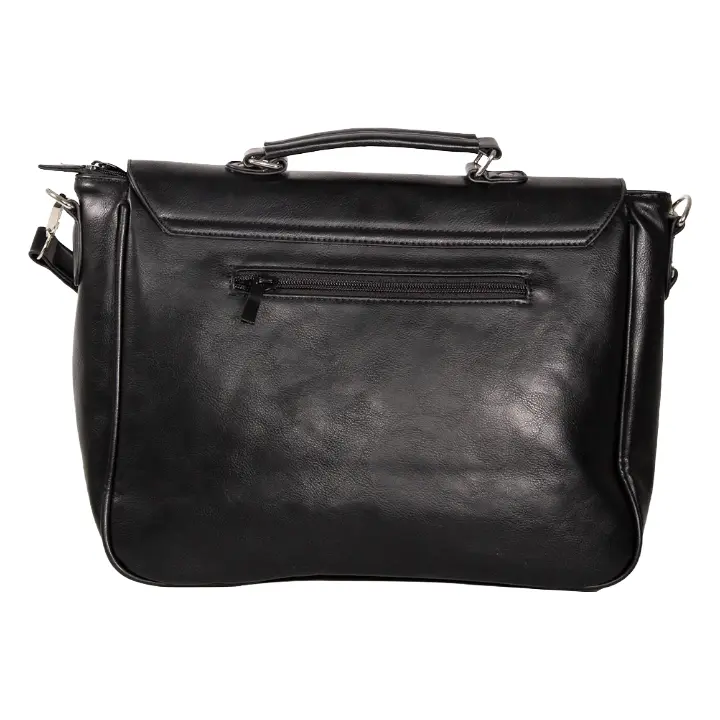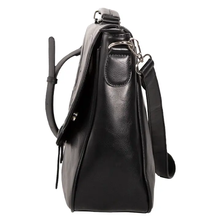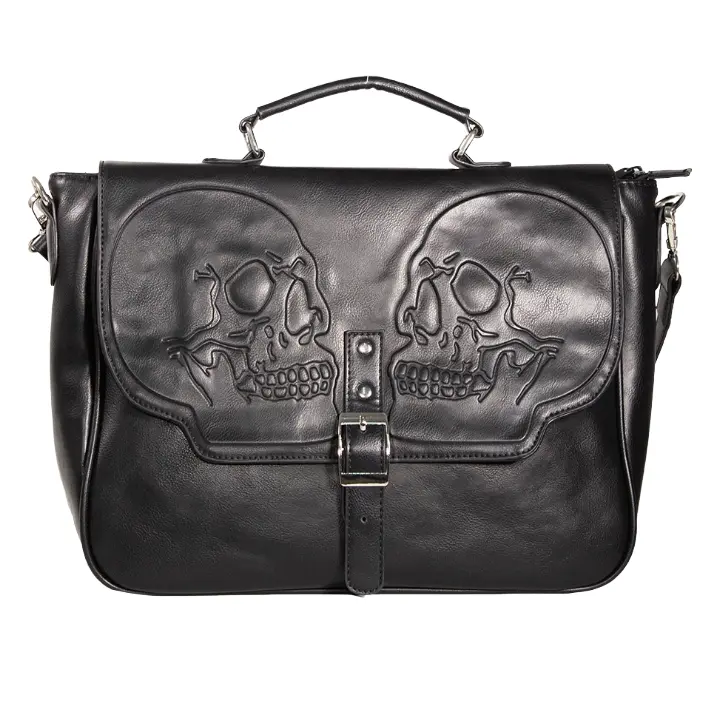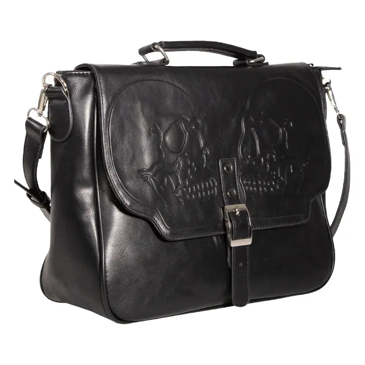 Crafted in a sleek black faux leather finish, this messenger bag features a striking embossed twin skull design across the front flap—adding texture, depth, and a powerful visual presence. The detailed skull artwork creates a standout yet wearable look that complements a wide range of alternative styles.