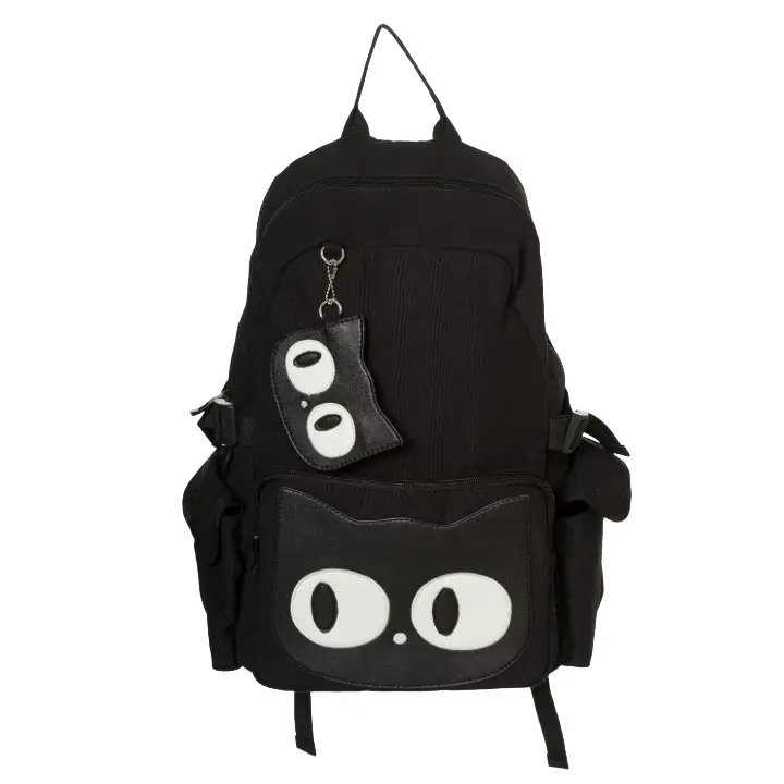 Crafted in a sleek black finish, this backpack features an adorable cat face design on the front pocket, along with a matching detachable cat keychain for added personality. The playful aesthetic makes it a standout piece while still being versatile enough for everyday wear.