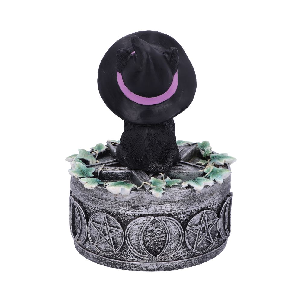 Sat on top of this Ivy Familiar Box, a small black cat sits looking longingly at onlookers waiting to be taken home. With a witches hat on its head, this cat fits the theme of the box which has been covered in Wicca symbols and ivy leaves. The perfect piece for keeping your most prized possessions safe. Cast in the finest resin before being carefully hand-painted, this familiar box is the perfect addition to any feline fanatics collection. Beautifully crafted cat box. Spacious yet stylish. Cast in the finest resin. Expertly hand-painted.