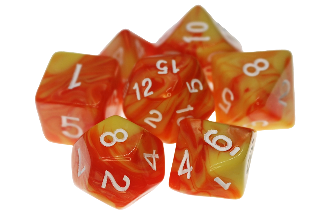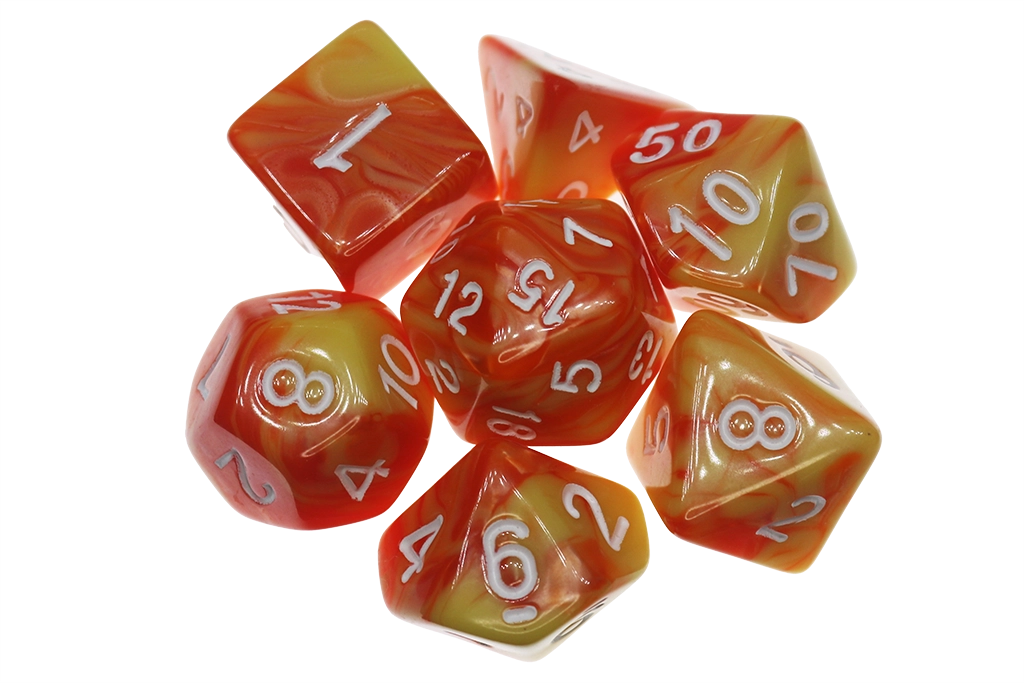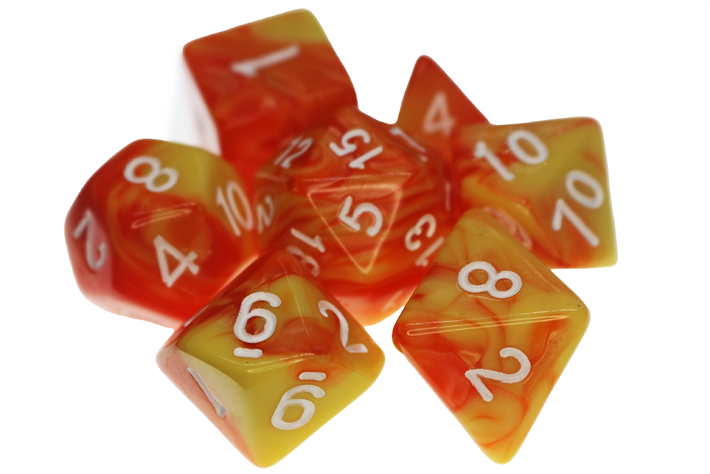 Ignite the flames of passion with our Lava Dice set, featuring fiery shades of red and yellow that evoke the raw power and intensity of molten lava. Each die is a testament to the primal forces of nature, inviting you to unleash your inner fire and conquer the gaming realm with confidence.