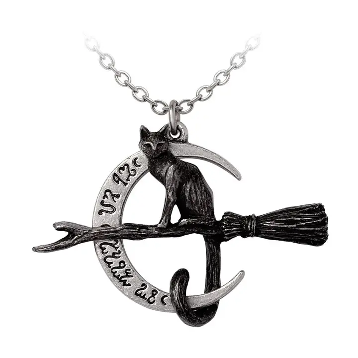 Black cats have long been associated with magic, guardianship, and spiritual intuition. Combined with the broom and crescent moon, this pendant creates a striking symbol of nocturnal power and occult mystery.