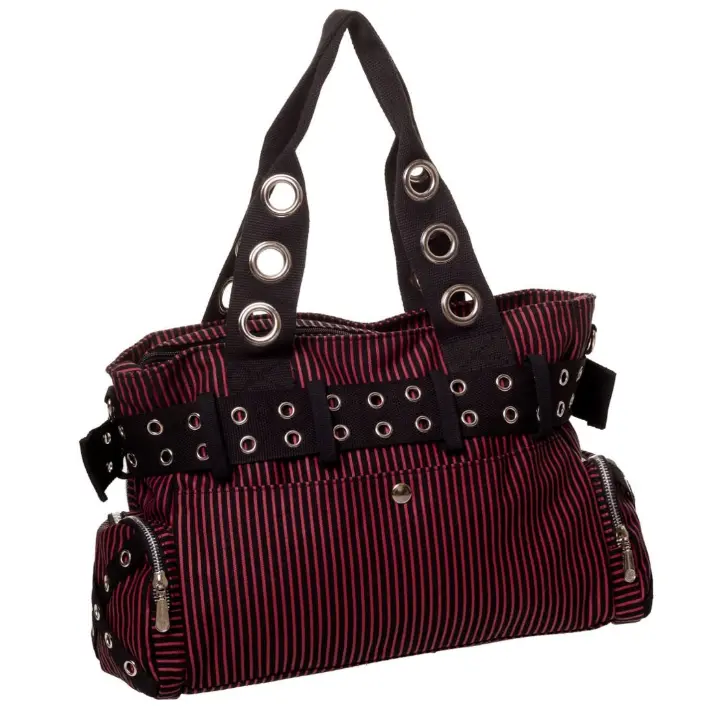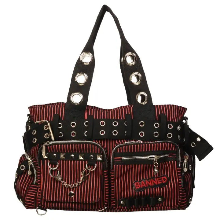 Designed with striking red and black stripe fabric, this eye-catching handbag is packed with attitude. Featuring metal studs, chain detailing, eyelet straps, and multiple zip compartments, it delivers both style and practicality in one standout piece.