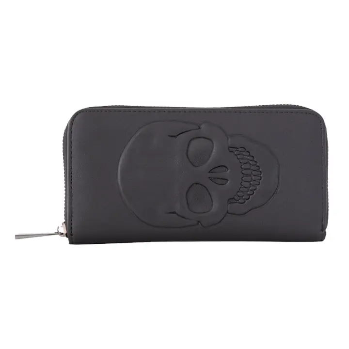 This wallet features a bold embossed skull design across a smooth black exterior, creating a subtle yet striking gothic aesthetic. The clean, monochrome finish gives it a premium look while remaining versatile enough to pair with any outfit.